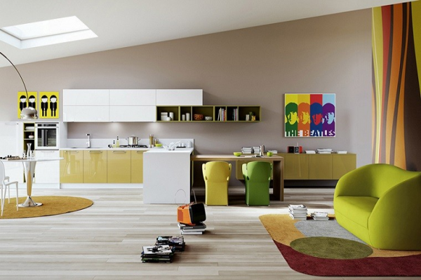 Interior pop art dengan dapur dan ruang keluarga yang menyatu.