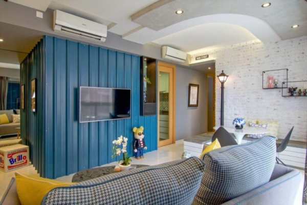 Interior ruang tamu dengan kombinasi warna biru-hitam nya.