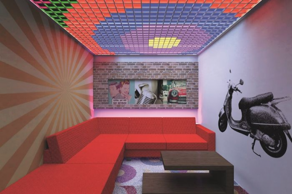 Interior ruang keluarga bergaya pop art dengan lampu sorot yang cantik.
