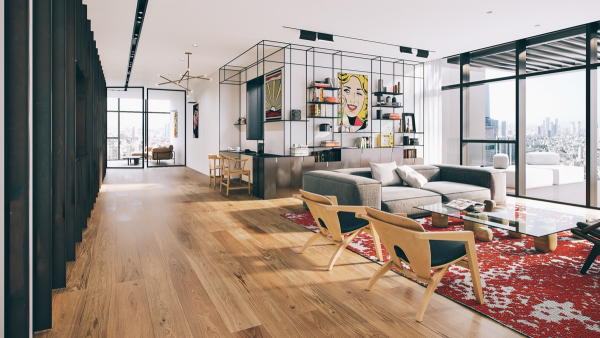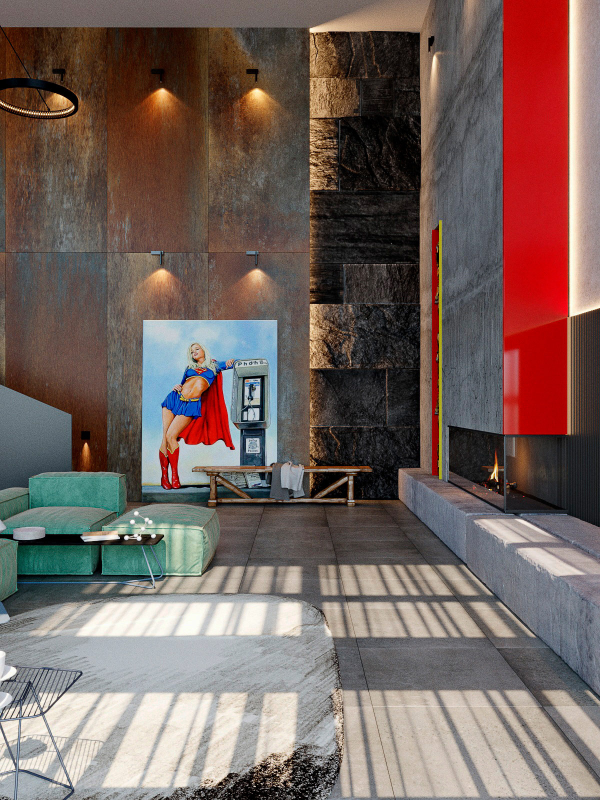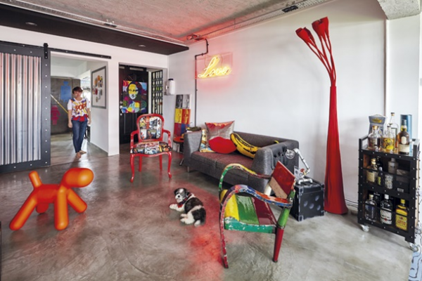 Interior ruang tamu bergaya pop art dengan lantai beraksen semen ekspos yang menarik.