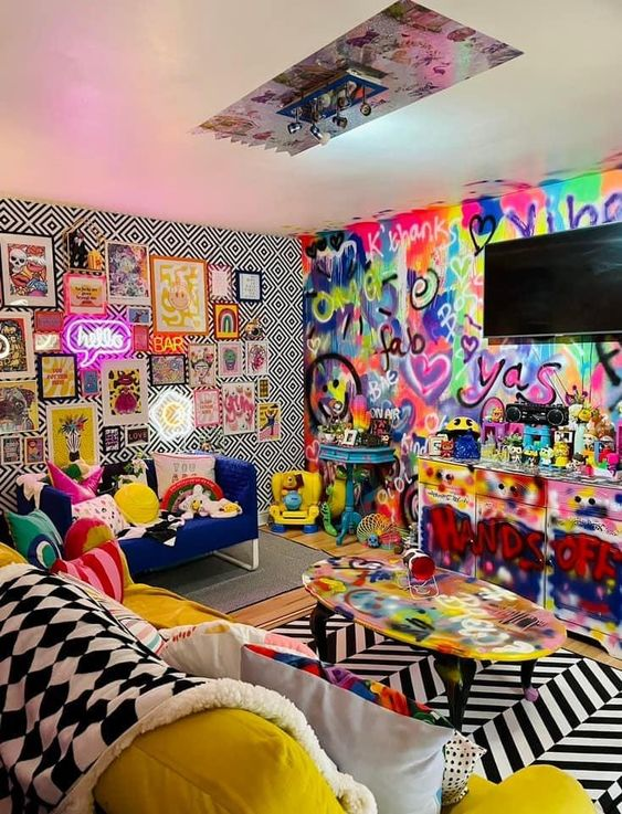 Gaya Pop Art adalah gaya seni yang populer pada tahun 1950-an dan 1960-an, yang terkenal karena penggunaan warna-warna cerah, gambar yang kuat dan jelas, dan gaya grafis yang menarik. Jika Anda ingin membuat desain interior rumah bergaya Pop Art yang cantik, berikut adalah beberapa inspirasi yang dapat Anda gunakan: