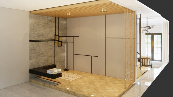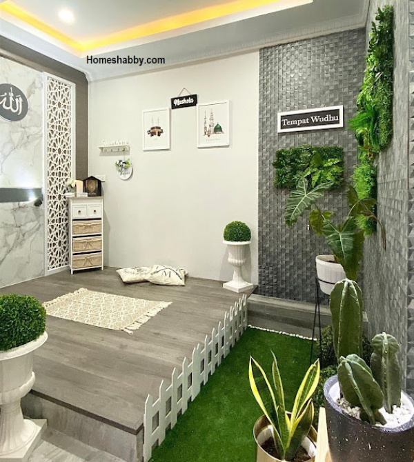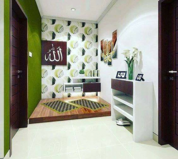 - Anda juga bisa mempertimbangkan untuk menempatkan mushola di dalam ruang tamu. Agar terlihat lebih eksklusif dan terpisah dari area utama, Anda bisa menggunakan partisi atau dinding kaca untuk memisahkan ruangan beribadah dari ruang tamu.