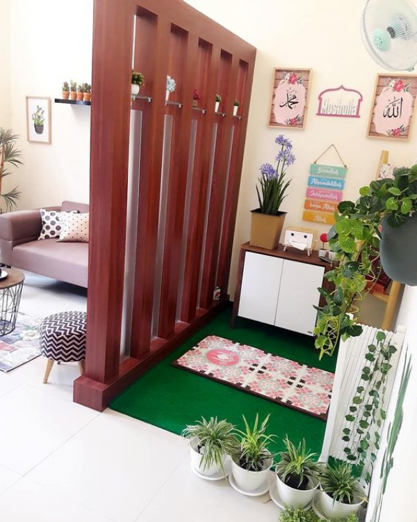 Mushola dalam rumah dengan partisi kayu yang menarik.