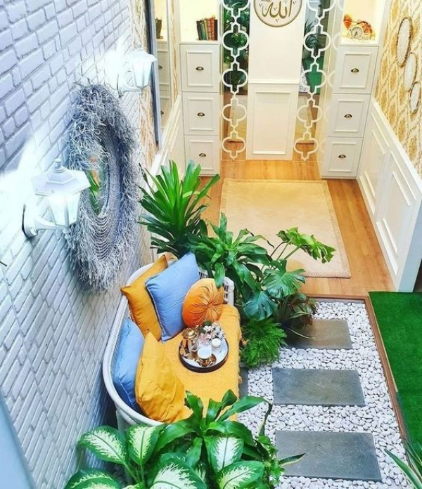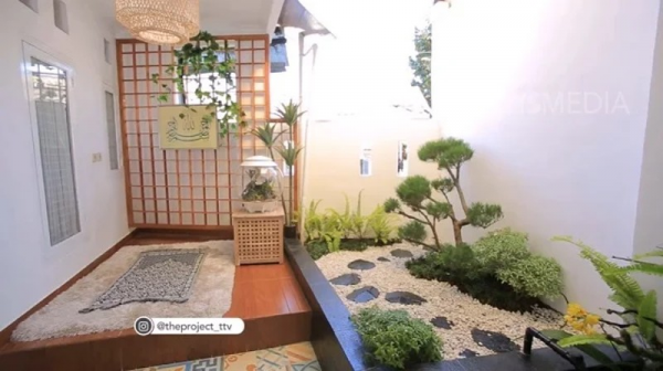 Desain mushola bawah tangga dengan taman dan kolam mungil yang cantik.