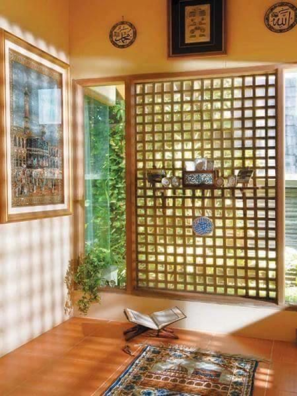 - Jika Anda ingin memiliki mushola yang terintegrasi dengan ruangan keluarga, Anda bisa mempertimbangkan untuk membuat dinding kaca yang memungkinkan pencahayaan masuk ke dalam mushola. Dinding kaca juga membuat ruangan terlihat lebih lapang dan modern.