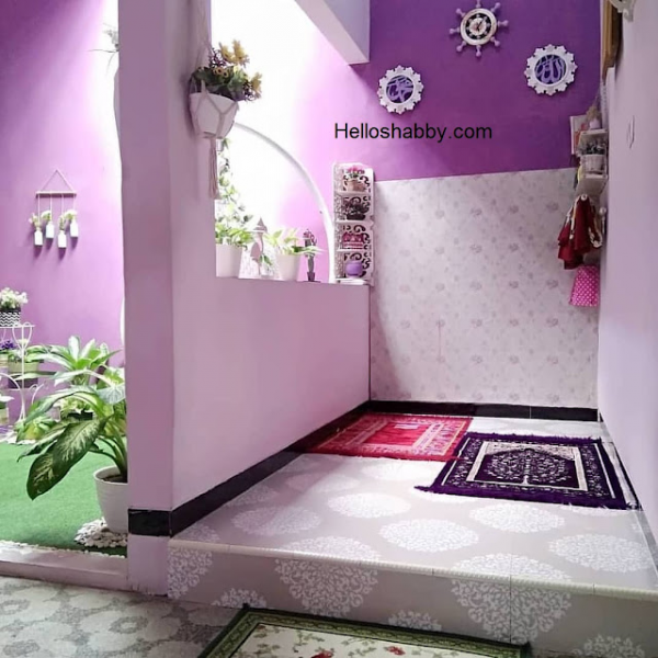 Mushola dalam rumah dengan nuansa ungu yang cantik.