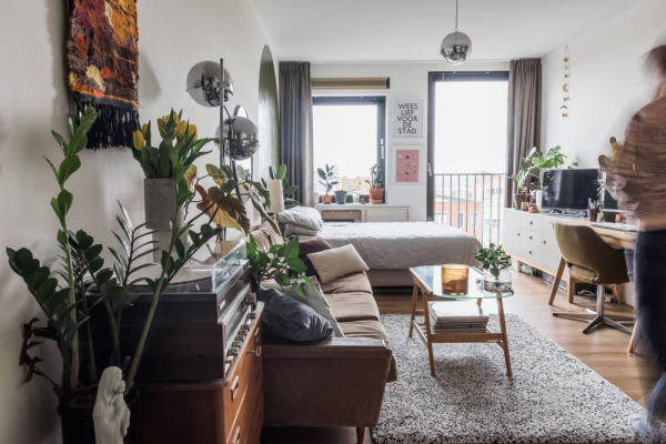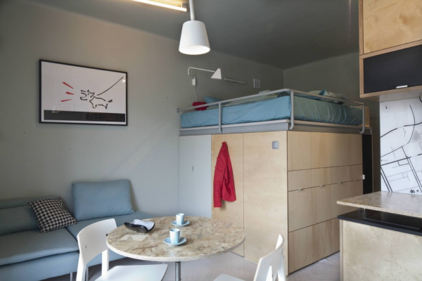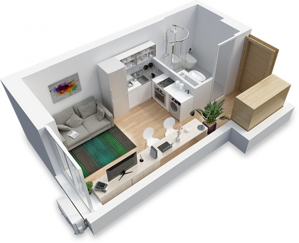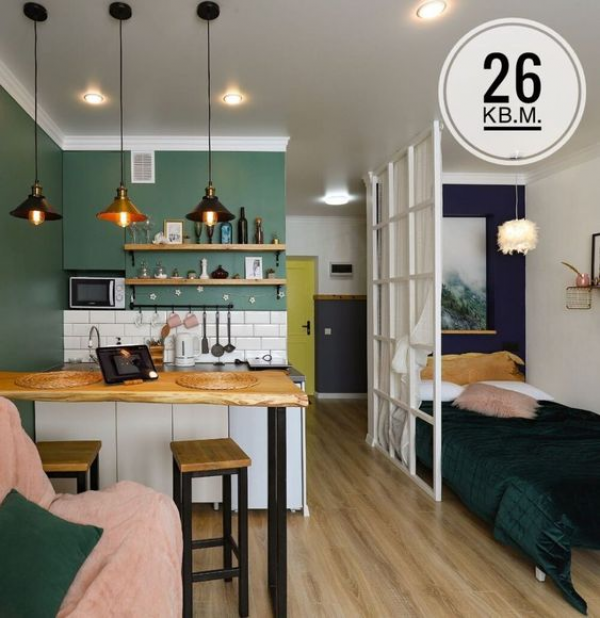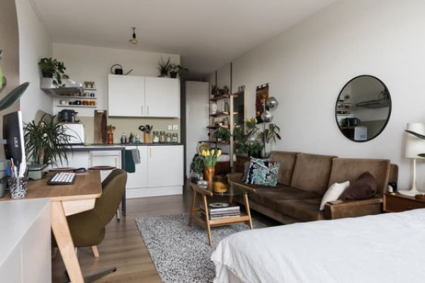 Apartemen dengan kamar, dapur dan ruang kerja yang menyatu.