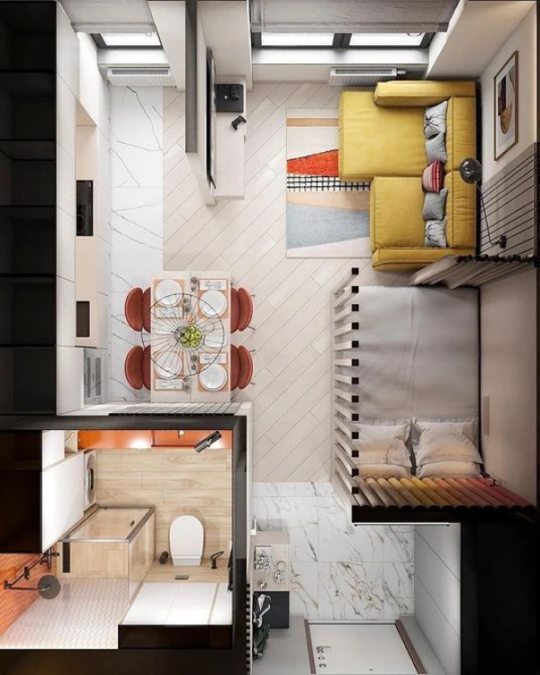 Ini inspirasi denah interior apartemen dengan sofa bednya.