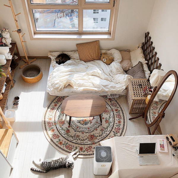 Dengan sekat transparan yang jadi pemisah antara ruang tamu dan ruang tidur.