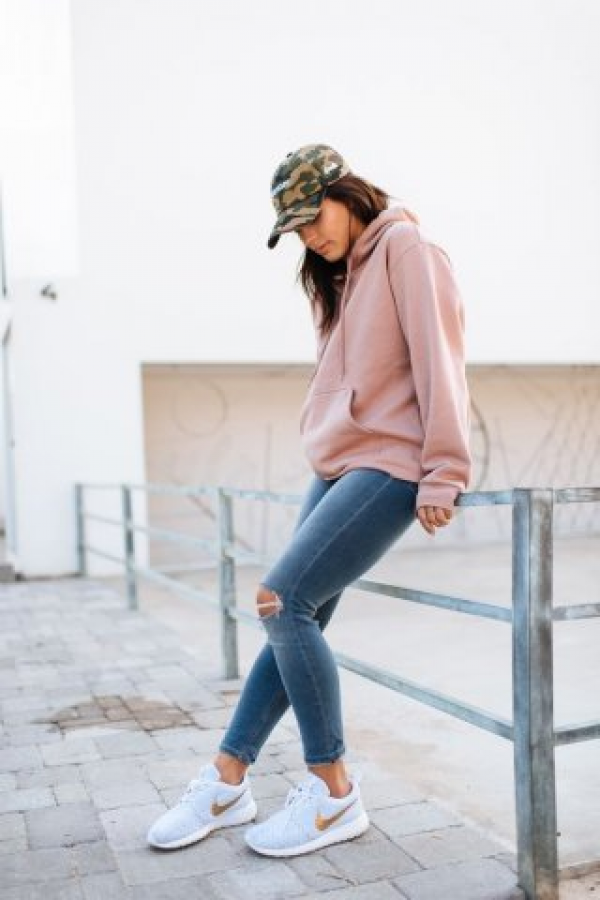 Hoodie dengan bawahan celana denim model sobek yang manis.