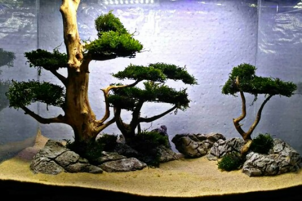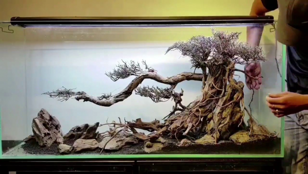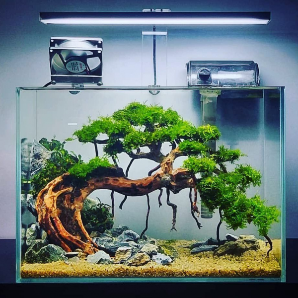 Aquascape dengan batuan alam dan pohon tuanya yang keren.