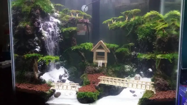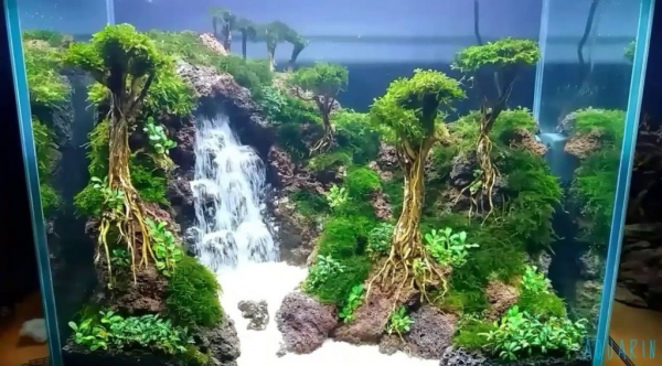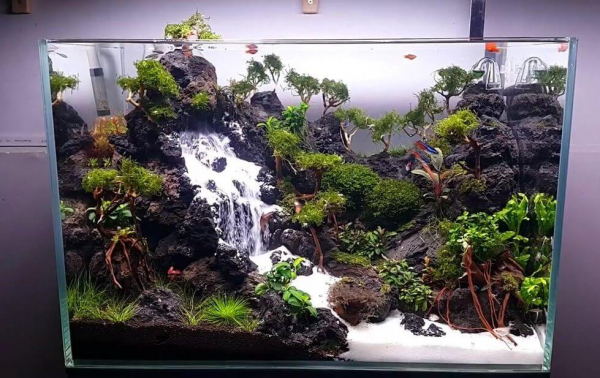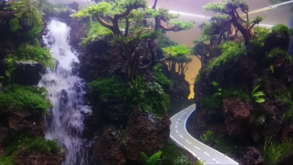 Aquascape dengan pemandangan air terjunnya yang cantik.