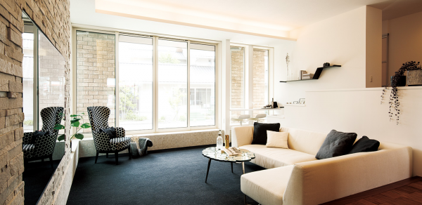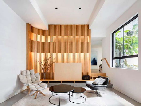 Interior ruang tamu Jepang modern dengan sentuhan dinding batu alamnya.