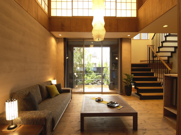Ruang keluarga rumah Jepang dengan lampu sorotnya yang cantik.