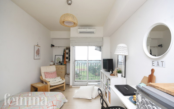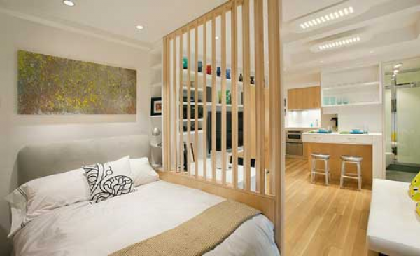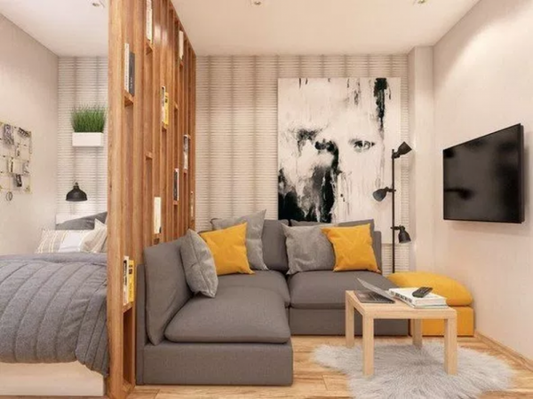 Ruang tamu dan kamar tidur yang terpisah dengan partisi minimalis yang cantik.