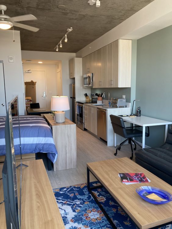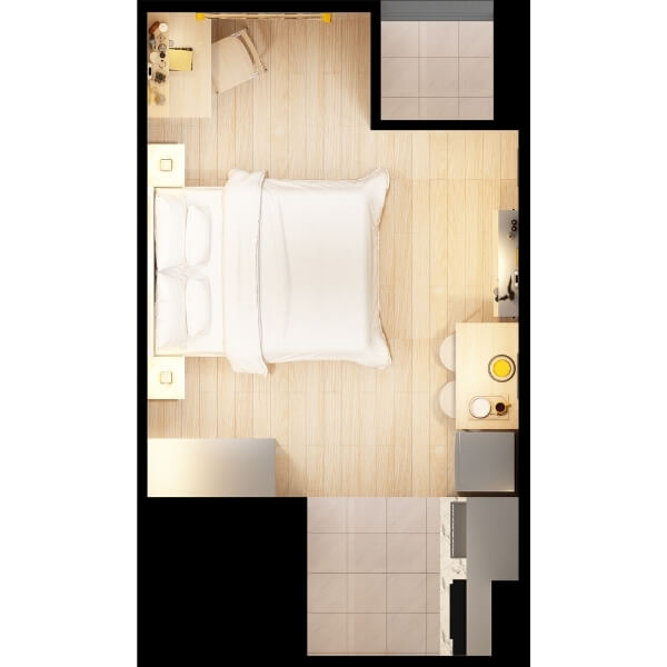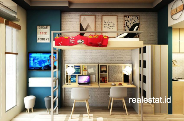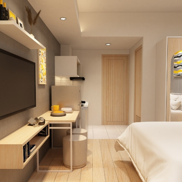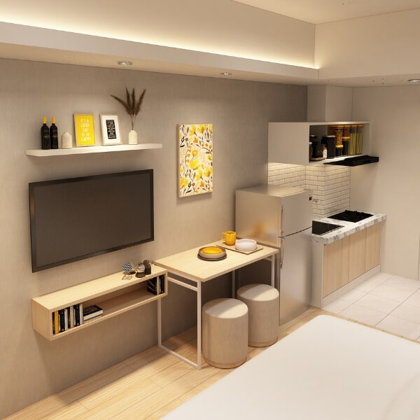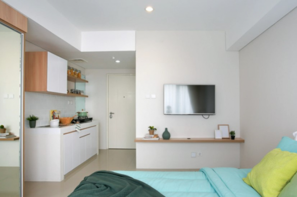 Yang dimaksud dengan apartemen tipe Studio adalah apartemen yang hanya terdiri satu ruangan saja namun mencakup semua fungsi mulai dari tempat tidur, dapur, area belajar, lemari, hingga kamar mandi.