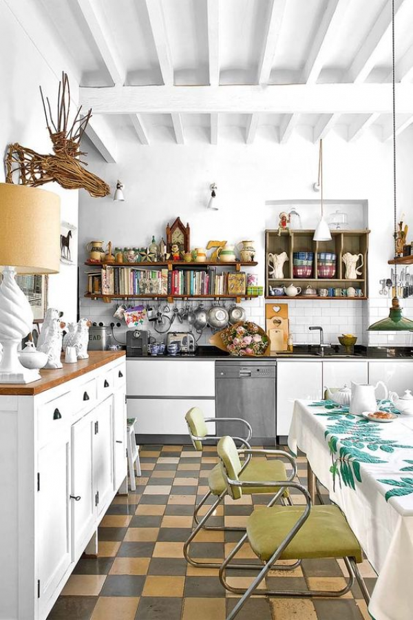 Dapur dengan anek pernak-pernik yang unik serta motif penutup meja yang menawan.