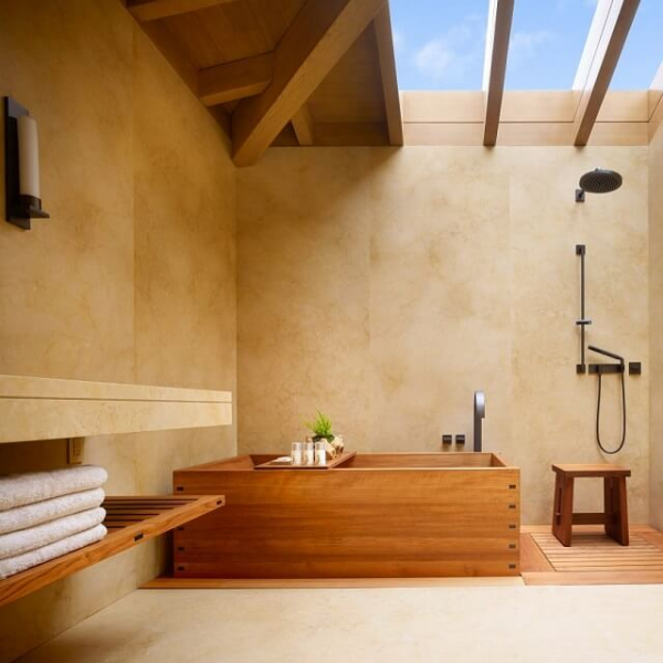 Kamar mandi dengan desain yang terbuka dengan atap transparan yang cantik.
