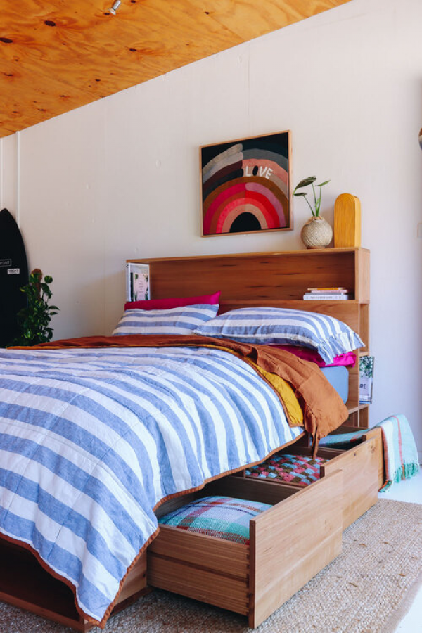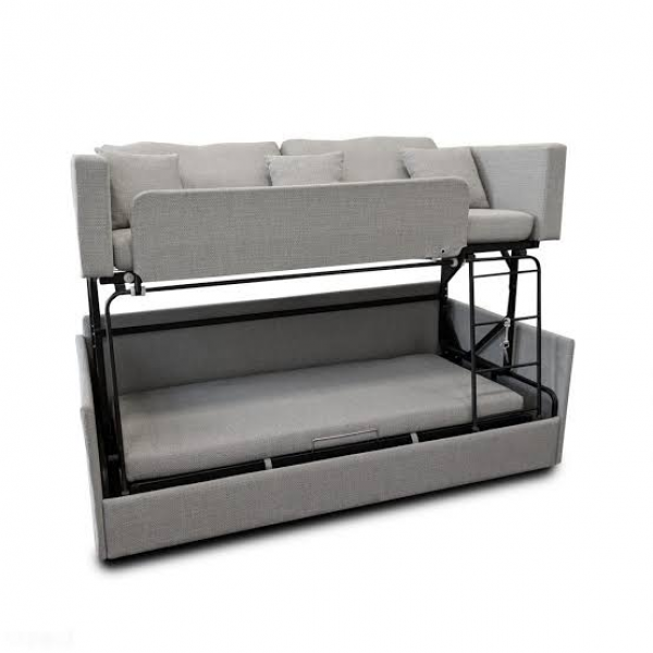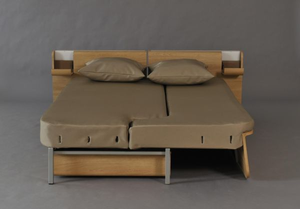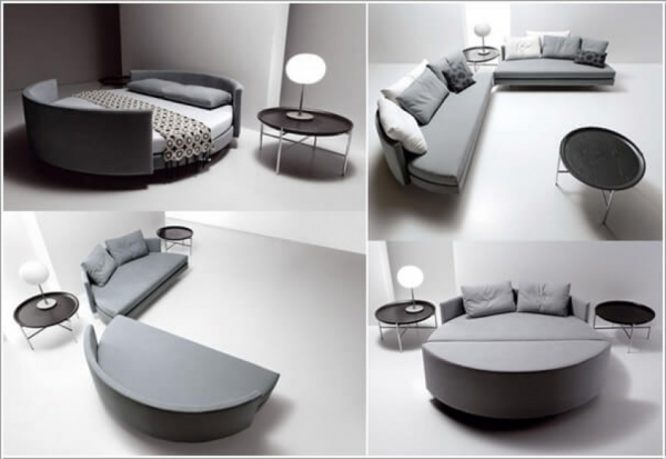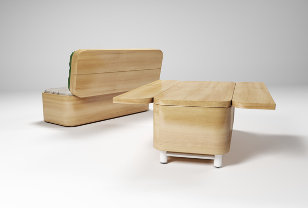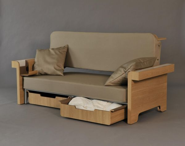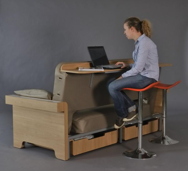 Sofa, tempat tidur, meja kerja dan tempat menyimpanan barang-barang yang dijadikan satu.