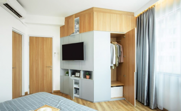Lemari, kabinet, meja tv serta pintu yang juga berfungsi sebagai meja.