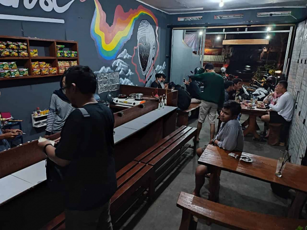 Dasain sederhana seperti tempat ngopi pada umumnya, namun dengan lahan parkir yang luas akan membuat orang yang nongkrong sambil menikmati kopi dan makanan tidak merasa kawatir jika ingin berlaman-lama.