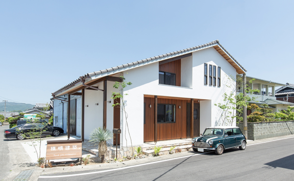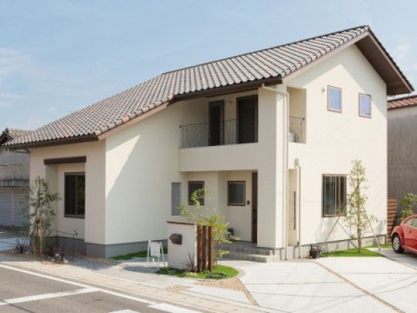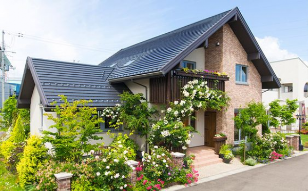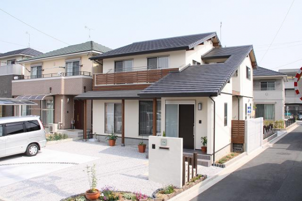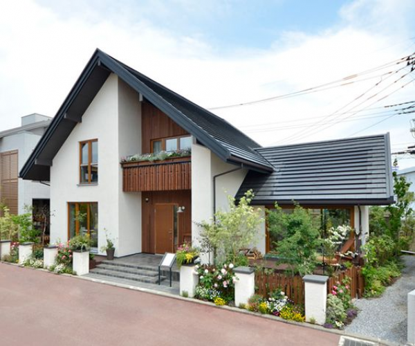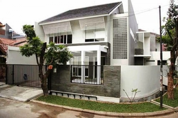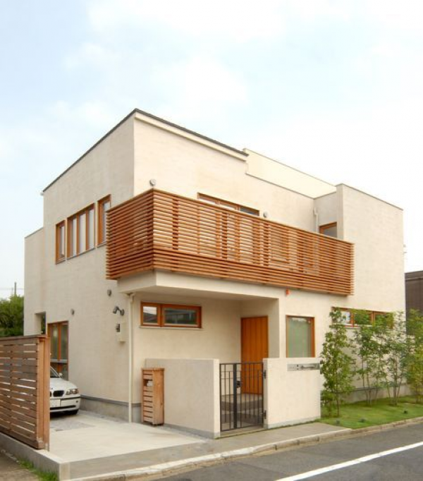 Desain rumah hook 2 lantai ala Jepang berwarna cream dan dipadukan dengan batu alam serta taman kecil yang cantik.