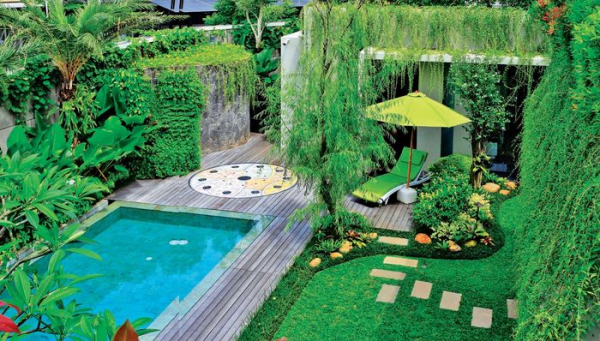 Memasukkan unsur air, seperti kolam renang atau ikan, juga dapat menambah nyaman suasana.
