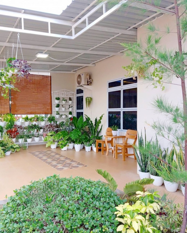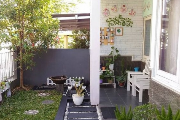 Teras yang sederhana dengan taman kecil serta bunga tang tersusun baik didalam pot.
