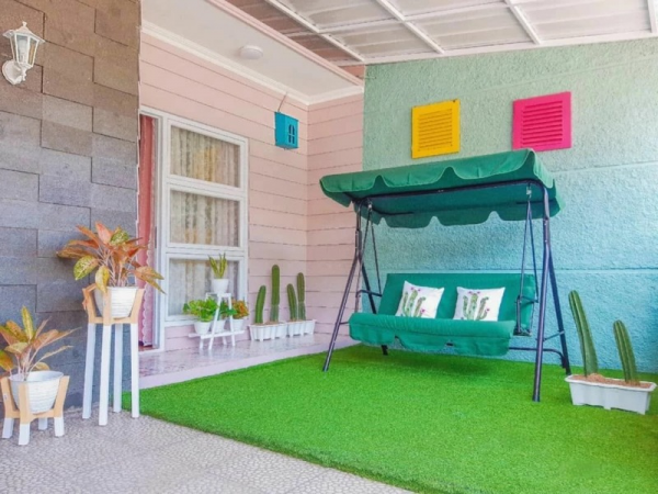 Pemilihan furniture dan rak bunga yang pas dipadukan dengan rumput sintetis, menambah asri suasana teras anda.