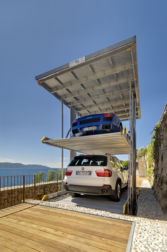 Garasi indoor dengan sistem hidrolik seperti ini dapat menampung koleksi mobil anda.