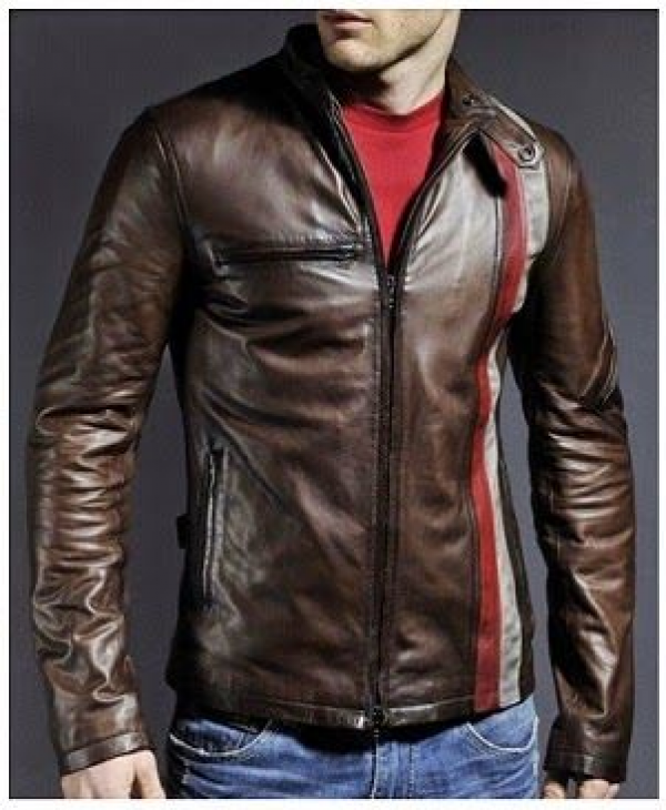 Jaket kulit pria dengan warna kombinasi yang keren ya.
