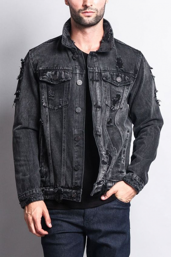 Jaket denim pria yang dikombinasikan dengan bahan lainnya.