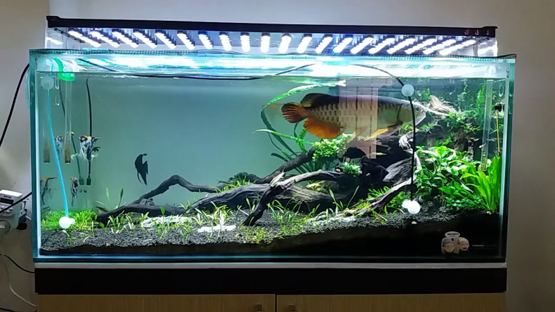 Desain aquarium arwana juga dapat ditambahkan dengan lampu. Lampu yang digunakan yang memiliki spectrum cahaya matahari agar arwana tetap sehat dan warnanya muncul. Lampu hanya boleh dinyalakan selama 12 jam, karena pada malam hari arwana dapat beristirahat tanpa lampu. Selain membutuhkan lampu, aquarium juga dapat didesain dengan beberapa hiasan. Hiasan digunakan untuk menambah nilai estetis pada aquarium. Namun, hiasan yang digunakan juga harus tetap dipertimbangkan fungsinya agar arwana tetap leluasa berenang. Hiasan yang dapat digunakan dalam aquarium seperti pohon-pohonan, rumah-rumahan, benteng serta berbagai hiasan lainnya.
