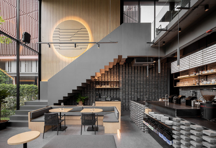 Cafe dengan desain minimalis dan warna monokrom untuk kesan modern dan elegan