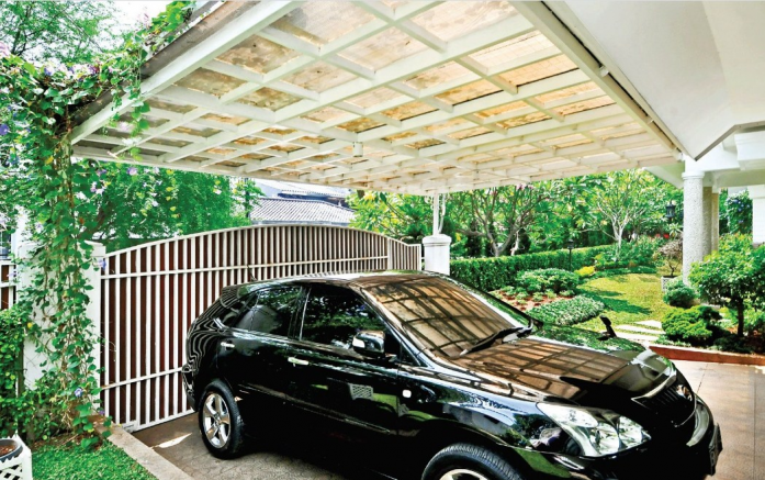 Model transparan yang satu ini memang cukup unik karena cahaya bisa masuk dengan sempurna sehingga carport akan terasa lebih luas. Selain itu, warna putih akan menghadirkan kesan minimalis namun tetap terasa mewah karena adanya sentuhan tralis yang keren dari pagat.
