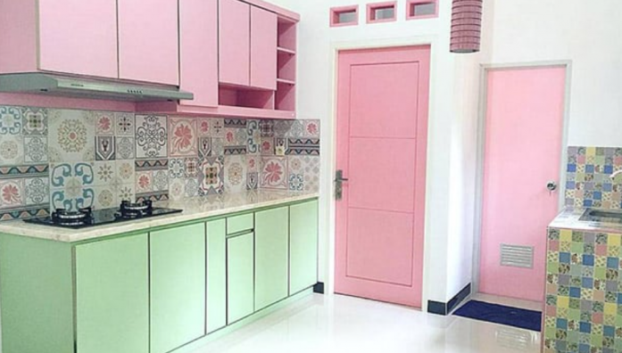Dapur dengan perpaduan warna pastel yang lembut dan elegan