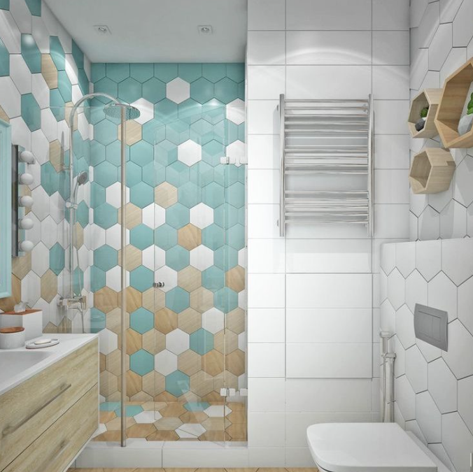 Dinding kamar mandi dengan aksen ubin hexagonal