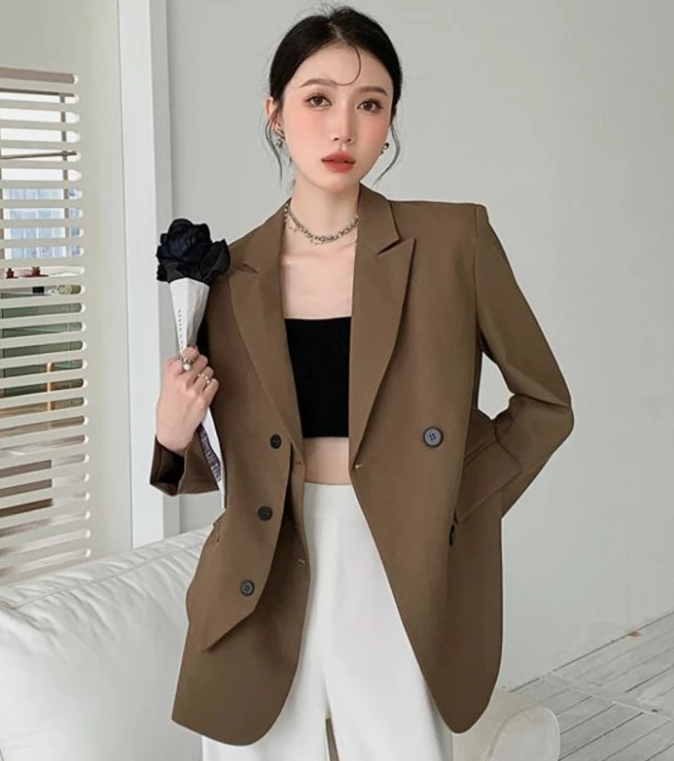 Jas wanita dengan desain double-breasted dan kerah yang lebar