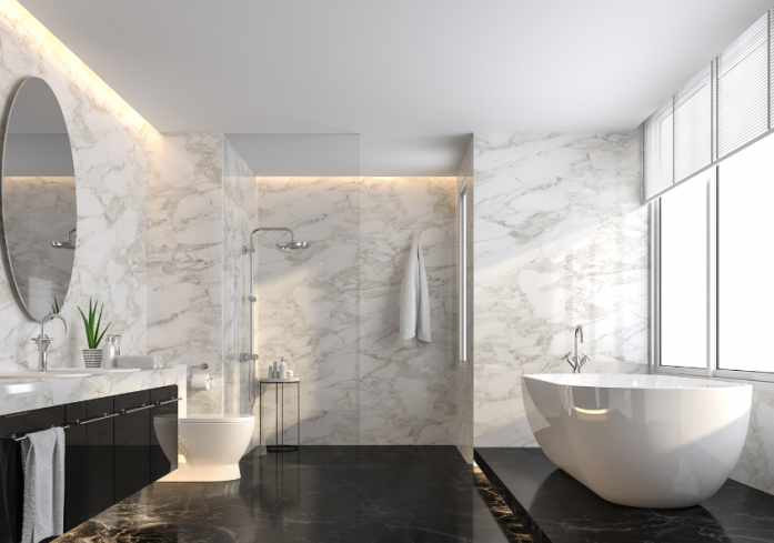 Kamar mandi dengan bak mandi berbentuk oval dan lantai marmer