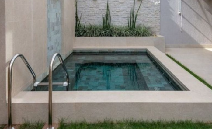 Kolam renang kecil dengan desain minimalis dan garis-garis geometris