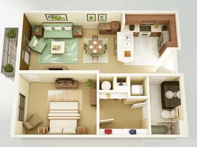 Jika kamu masih lajang ataupun baru menikah mempunyai model rumah dengan desain 1 kamar ini bisa jadi pilihan. Dengan taman yang berada tepat didepan kamar tidur utama, akan terasa sejuk dan segar jika kita membuka jendela kamar. Sinar matahari juga bisa langsung masuk ke area kamar.