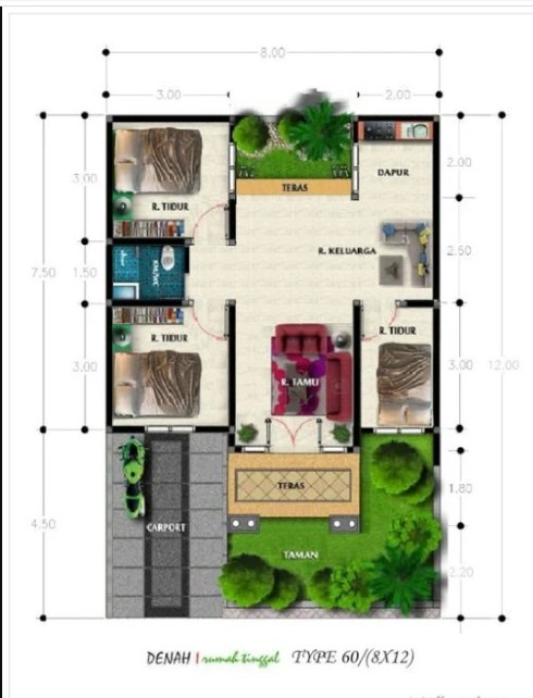 Desain kamar tidur utama walaupun ukurannya tidak terlalu luas tetapi jika dilakukan dekorasi maka akan terlihat indah dan nyaman . Pada bagian samping kita bisa menambahkan gahar rumah yang akan dibangun berlantai 2.