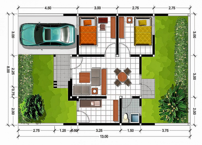 14. Denah Desain Rumah 6x8 Simple berikut ini cocok untuk keluarga baru menikah karena rumah ini cukup kecil dan sederhana hanya da 2 kamar tidur