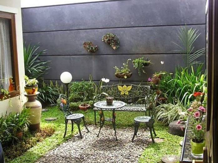 9. Taman minimalis dengan taman berjemur dan kursi santai
