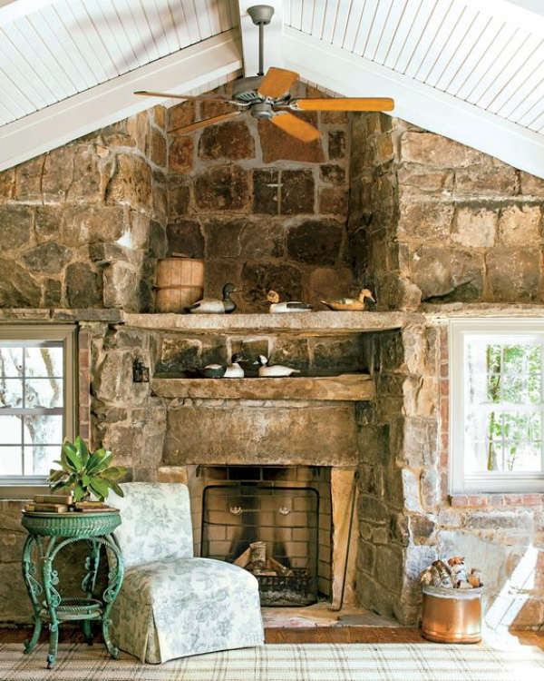 Ruang keluarga cottage style dengan sentuhan batu alam nya.