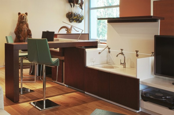 Interior ruang keluarga dengan dapurnya yang menarik.