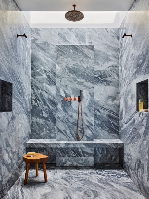 Kamar mandi dalam desain rumah Hampton menampilkan gaya yang elegan dan mewah. Bathtub berdiri bebas, wastafel marmer, dan aksen kayu memberikan nuansa klasik yang menenangkan.
