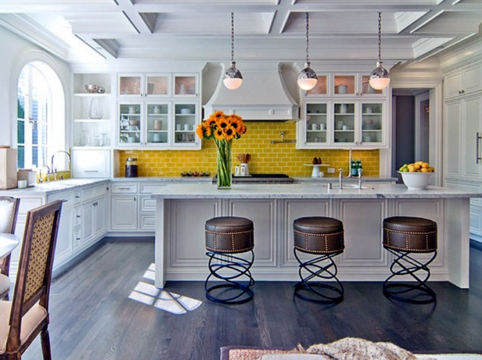 Desain klasik untuk kitchen island dengan tempat duduk tambahan