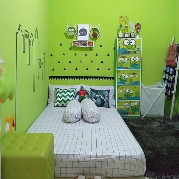 Kamar kosan dengan warna hijau yang menarik.