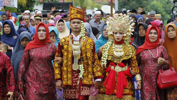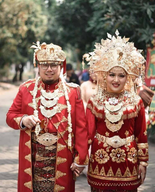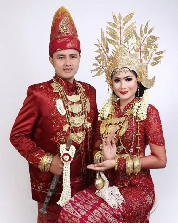 Berikutnya ada pakaian adat dari Sumatera Barat, pakaian adat ini memiliki ciri khas yakni berwarna merah menyala serta menggunakan mahkota kepala yang disebut dengan Suntiang.